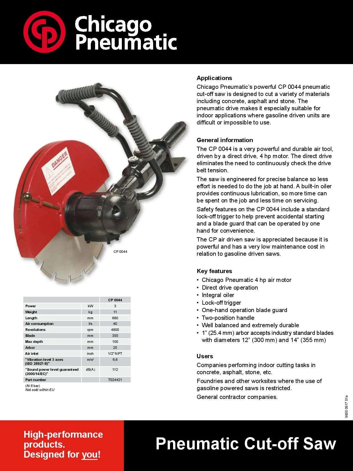 Our CP 0044 Air Saw is a very powerful and durable air tool, driven by a direct drive, 4 hp motor.